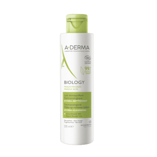 A-DERMA BIOLOGY Dermatologické odličovacie mlieko HYDRATAČNÉ-ČISTIACE jemne čistí pleť, odstraňuje mejkap a nečistoty pleti. Nevysušuje pleť. Bezoplachová starostlivosť pre krehkú pleť.