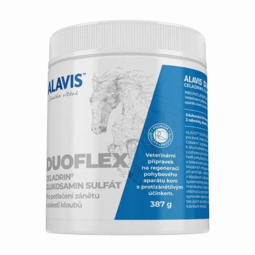 ALAVIS™ Duoflex je veterinárny prípravok pre kone, ktorý obsahuje patentovanú látku Celadrin® a glukózamín sulfát, je určený na dlhodobé podávanie koňom s pohybovými problémami. Podáva sa pri celom rade pohybových problémov, odstraňuje zápal a bolestivosť a pôsobí na regeneráciu kĺbových chrupaviek. Uplatňuje sa najmä pri artritíde – zápalový proces prebiehajúci v kĺboch v dôsledku rozpadu chrupavky, systematicky posilňuje a zvlhčuje bunkové membrány a zaisťuje bunkám pružnosť. Zlepšuje kvalitu synoviálnej tekutiny chrániacej kĺby a udržiava tak ich pružnosť a pohyblivosť.