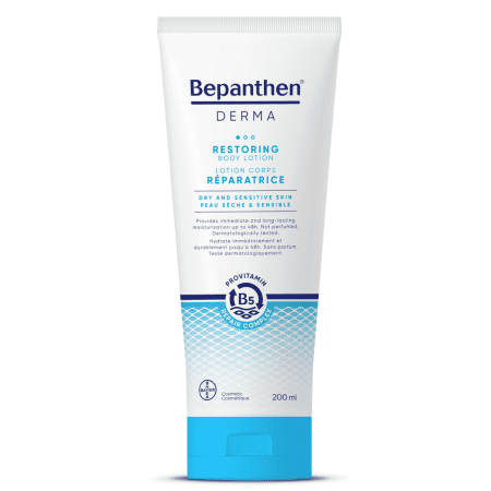 Bepanthen DERMA hydratačné a vyživujúce telové mlieko rýchlo zmierňuje pnutie suchej pokožky, poskytuje dlhotrvajúcu starostlivosť a zanecháva pokožku jemnú a hladkú na dotyk. Zložky, nachádzajúce sa v telovom mlieku Bepanthen DERMA a obnovujúci komplex s provitamínom B5 prenikajú do kože a pôsobia v jej hlbokých vrstvách: