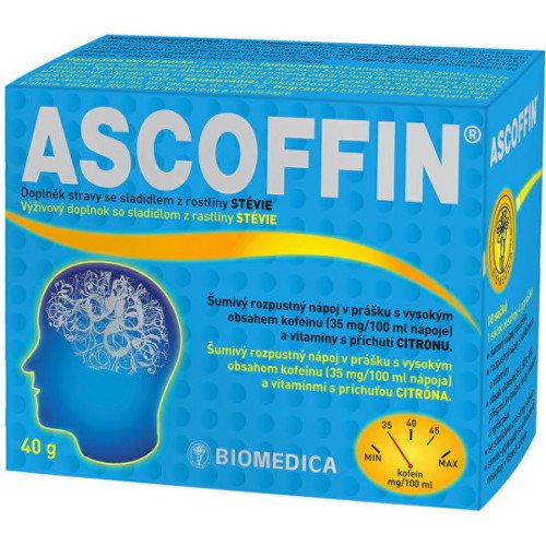 Výživový doplnok ASCOFFIN, rozpustný nápoj s kofeínom a vitamínmi.