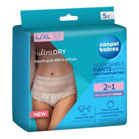 Jednorazové popôrodné nohavičky s vnútornou vložkou 2v1. Veľkosť L/XL je vhodná pre ženy s obvodom bokov od 110 do cca 130 cm. Nohavičky sú určené pre ženy v prvých dňoch po pôrode a taktiež pre ženy trpiace inkontinenciou, či silnou menštruáciou. Balenie obsahuje 5 kusov.