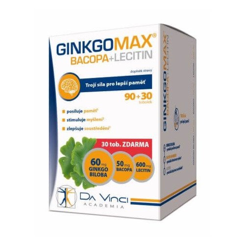 GINKGOMAX+BACOPA+LECITÍN je výživový doplnok, ktorý je unikátny svojím inovovaným a posilneným zložením s obsahom štandardizovaného extraktu z Ginkgo biloby (60 mg/tob.), vysokým obsahom Lecitínu (600 mg/tob.) a novopridanej látky Bacopa monnieri (50 mg/tob.). Synergické pôsobenie týchto látok a najmodernejšie technológie výroby zvyšujú účinnosť prípravku.