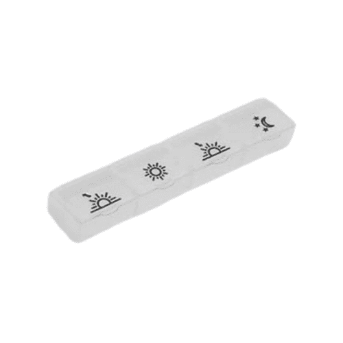 Každý deň je rozdelený na 4 časti: ráno x obed x večer x noc. Veľkosť dávkovača: 110 x 22 x 20 mm.