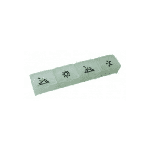 Každý deň je rozdelený na 4 časti: ráno x obed x večer x noc. Veľkosť dávkovača: 110 x 22 x 20 mm.