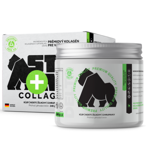 STRONG COLLAGEN obsahuje kombináciu prémiových, klinicky testovaných nemeckých kolagénov vo forme bioaktívnych kolagénových peptidov v optimálnom množstve až 160 000 mg v jednom balení. Jednotlivé typy kolagénu sú vybrané tak, aby bol zaručený príjem všetkých dôležitých typov kolagénu pre správne fungovanie pohybového aparátu (typ I, II, III, V, X). Vďaka bioaktívnej forme je STRONG COLLAGEN pre telo prirodzený, ľahko vstrebateľný a dobre využiteľný.