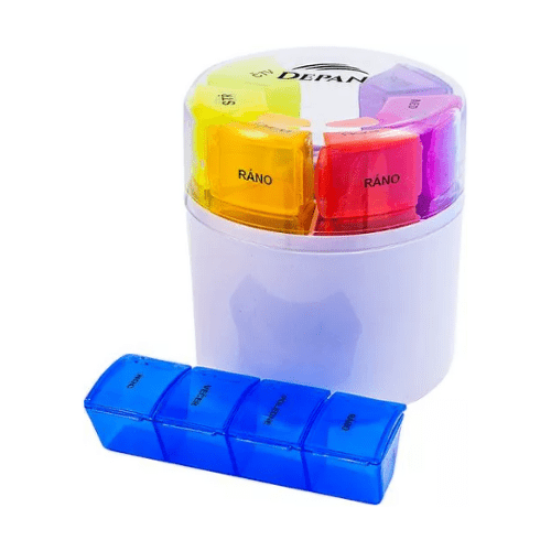 Praktický organizátor na ukladanie tabletiek so samostatným puzdrom na každý deň v týždni. V každom puzdre sú štyri priehradky, vďaka ktorým je možné presne naplánovať dávkovanie lieku štyrikrát denne: ráno, popoludní, večer, v noci.