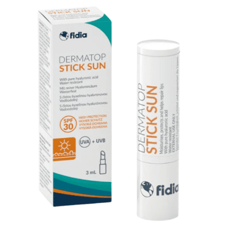 Hydratačná, ochranná a regeneračná tyčinka na pery na báze kyseliny hyalurónovej.