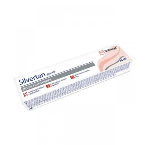 Prípravok Silvertan pasta s obsahom ionizovaného striebra naviazaného na zeolit, 10% oxidu titaničitého a dexpanthenolu je určený k starostlivosti o pokožku v miestach so sklonom k plienkovým dermatitídam, zapareninám a preležaninám. Pomáha redukovať mokvanie, znižuje možnosť dráždenia pokožky vonkajšími vplyvmi (moč, stolica) a pomáha chrániť ošetrené miesta pred začervenaním. Vhodný aj do plienkovej oblasti a do miest kožných záhybov.