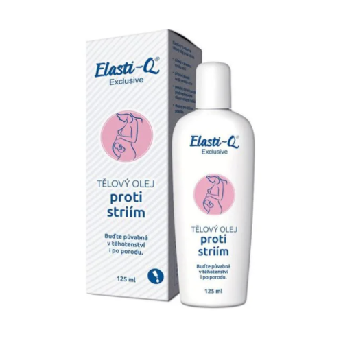 Elasti-Q® Exclusive telový olej pôsobí proti striám v oblasti bruška, ale aj stehien, bokov a v ďalších problematických partiách. Má príjemnú vôňu, výborne pokožku hydratuje a vyživuje, rýchlo sa vstrebáva a nezanecháva mastný film. Elasti-Q® Exclusive telový olej: účinný v prevencii vzniku strií priaznivo pôsobí na už vzniknuté strie pri užívaní po pôrode rýchlo zatiahne brucho chráni pokožku pred škodlivým pôsobením voľných radikálov Bez parafínu, farbív a konzervačných látok.