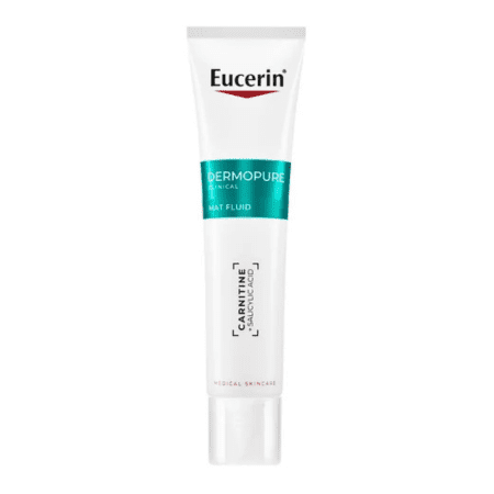 Eucerin DermoPure CLINICAL Zmatňujúci fluid redukuje tvorbu nadmerného kožného mazu. Obsahuje unikátnu kombináciu karnitínu a čistej kyseliny salicylovej (BHA).