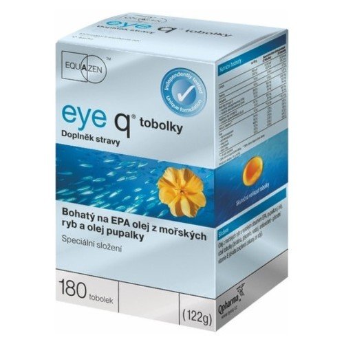 Výživový doplnok eye q poskytuje ľahký a vhodný spôsob, ako dodať telu viacnenasýtené mastné kyseliny omega-3 a omega-6 vo vyvážených pomeroch. Zloženie: olej z morských rýb (s obsahom EPA), pupalkový olej, vitamín E. Pri výrobe eye q sa používajú výlučne prírodné, vysoko kvalitné zložky. Zdrojom nášho rybieho oleja sú sardinky a sardely, známe tým, že obsahujú prirodzene vysoké koncentrácie kyseliny eikosapentaénovej (EPA).