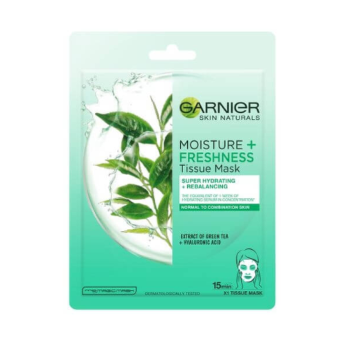 Garnier Skin Naturals super hydratačná textilná pleťová maska s osviežujúcim a čistiacim zložením obsahujúcim extrakt zo zeleného čaju, kyselinu hyalurónovú a glycerín. Zložky sú uchované oddelene až do aktivácie s textíliou.