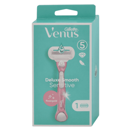 Dámsky holiaci strojček Gillette Venus Deluxe Smooth Sensitive oholí vašu pokožku dokonale vo všetkých smeroch a zanechá ju hodvábne jemnú. Vodou aktivované zvlhčujúce plochy okolo žiletiek chránia pokožku pred poranením, zatiaľ čo 3 ostré čepieľky s obsahom lubrikačného pásika SkinElixir hladko kĺžu po pokožke. Zaujme vás najmä štýlová, kovová zlatoružová rukoväť! Holiaci strojček Gillette Venus Sensitive Extra Smooth pre perfektný pocit z hladkej pokožky.