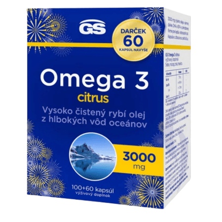 GS Omega 3 citrus sú 100% prírodné omega-3 kyseliny, ktoré obsahujú vyvážené množstvo najdôležitejších nenasýtených mastných kyselín – EPA a DHA. GS Omega 3 citrus dodáva telu ich optimálne, potrebné množstvo, a to navyše v prirodzenej forme tzv. triglyceridov, ktorá je až o 50 % lepšie vstrebateľná a pre organizmus využiteľná ako často používané polosyntetické etylestery. Vysoko čistený rybí olej z hlbokých vôd oceánov je navyše obohatený o vitamín D3 na podporu imunity, zdravé a silné kosti a zuby. To všetko v kapsule s citrónovou príchuťou.