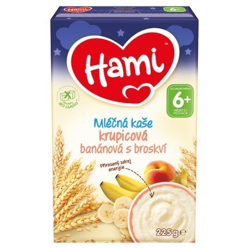 Potravina na báze obilia určená pre dojčatá a malé deti od ukončeného 6. mesiaca, v prášku. Hami mliečna kaša krupicová banánová s broskyňou bez pridaného cukru (obsahuje prírodné cukry) je vhodná ako chutná večera alebo raňajky pre malé brušká. Obsahuje obilniny (pšenicu), ktoré sú prirodzeným zdrojom energie pre každý deň plný zážitkov. Jedna porcia kaše denne tak pomáha postupne zavádzať nové chute obilnín či ovocia a vytvárať zdravé stravovacie návyky. Dôkladne vybrané a kontrolované obilniny pre malé brušká. Zdroj vitamínu D a vápnika podľa požiadaviek legislatívy. Bez konzervačných látok podľa zákona.