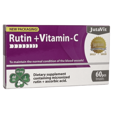 Výživový doplnok JutaVit Rutín + vitamín C s aktívnymi zložkami v 1 tablete: rutín 20 mg, vitamín C (kyselina L-askorbová) 50 mg (62,5% RVH) RVH – referenčná výživová hodnota.
