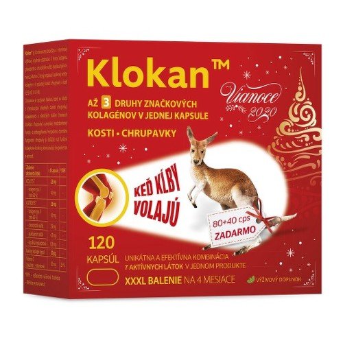 KlokanTM je kombinovaný živočíšny a vitamínový výživový doplnok obsahujúci 3 druhy kolagénu, glukózamín a chondroitín sulfát, kyselinu hyalurónovú a vitamín C, ktorý prispieva k normálnej tvorbe kolagénu a k prirodzenej funkcii chrupaviek a kostí.