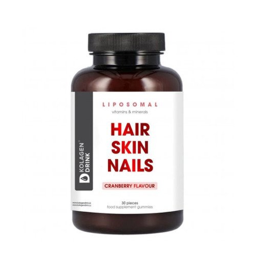KolagenDrink Liposomal HAIR, SKIN, NAILS (lipozomálne vitamíny a minerály pre vlasy, pokožku a nechty) – výživový doplnok s príchuťou brusnice vo forme gumených cukríkov. 30 kusov (dávok) v balení. Hmotnosť netto: 105 g. Bez konzervačných látok. Určené na podporu zdravia vlasov, pokožky a nechtov. Patentovaná lipozomálna technológia Soft Drop Technology zaručuje maximálne využitie aktívnych zložiek.