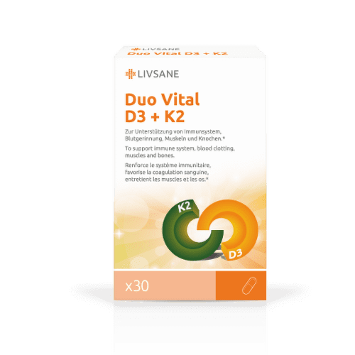 LIVSANE Duo Vital D3 + K2 kombinuje vitamín D3 a K2 vo výživovom doplnku. Obsiahnuté vitamíny významne prispievajú k udržaniu zdravia všetkých vekových skupín, napr. :