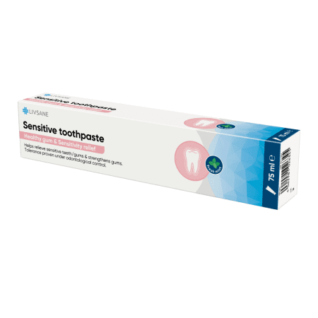 LIVSANE Zubná pasta Sensitive pomáha zmierňovať citlivosť zubov a ďasien, posilňuje ďasná. Znášanlivosť prípravku sa preukázala pod dohľadom lekára.