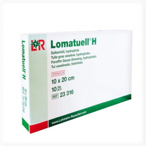 LOMATUELL H – Sieťovaný tyl hotový na použitie, impregnovaný bielou vazelínou na šetrné ošetrenie povrchových rán. Tyl s veľkými okami podporuje odvádzanie exsudátu. Biela vazelína zabraňuje zlepeniu s ranou. Tak je možná bezbolestná výmena krytia. Neutrálny podklad pre masť ponúka možnosť doplnkovej medikácie špecifickej pre danú ranu.