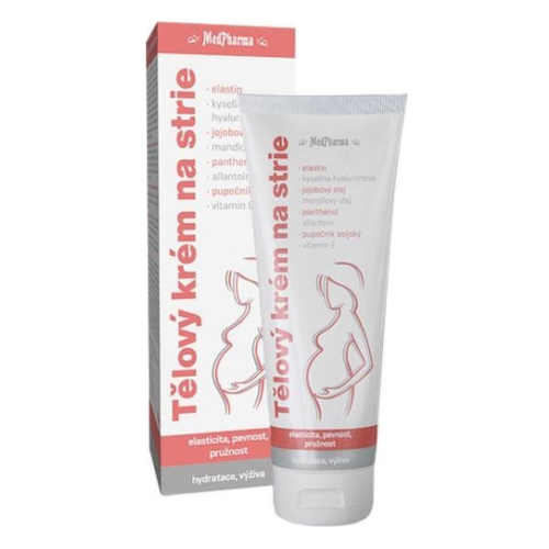 MedPharma Telový krém na strie je ideálny pre masáž počas tehotenstva v oblasti brucha, stehien, zadku, bedier a pŕs. Po tehotenstve podporuje spätnú obnovu pokožky. Krém je tiež vhodný pri rýchlom raste v období puberty. Rýchlo sa vstrebáva a nezanecháva mastný film.