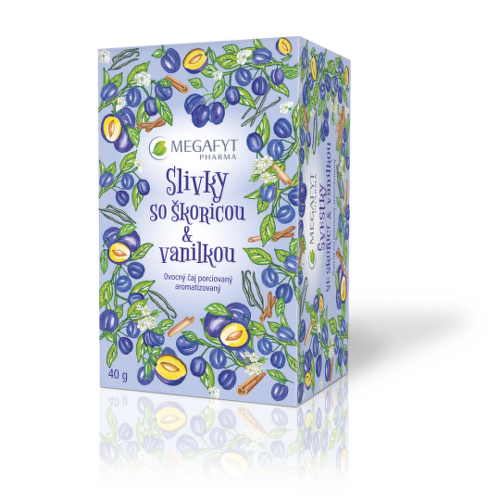 Ovocný aromatizovaný čaj s príchuťou slivky, škorice a vanilky, porcovaný v nálevových vrecúškach.