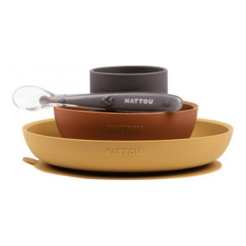 NATTOU Set jedálenský silikonový bez BPA hnedo-terakotový 4 ks