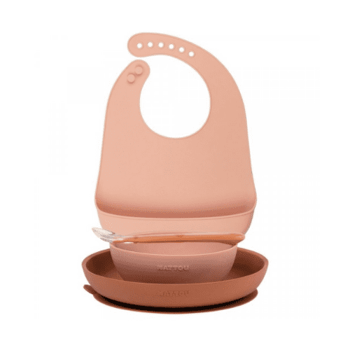 Štvordielny jedálenský set od Nattou z mäkkého silikónu je veľmi praktický, ľahko uchopiteľný a protišmykový. Set obsahuje tanierik a misku s prísavkou, lyžičku s mäkkým koncom a podbradník v krásnych moderných farbách. Zaoblené vnútorné hrany misky a tanierika uľahčujú naberanie potravín detičkám aj ich rodičom. Lyžička je perfektne prispôsobená malým ručičkám a ústam bábätiek a malých detí, vďaka čomu je ideálnym spoločníkom na kŕmenie a učenie sa samostatnosti. Spolu so silikónovým podbradníkom môžu rodičia a deti bez obáv jesť a užívať si vzájomnú spoločnosť. Podbradník sa ľahko nasadzuje a je nastaviteľný v 6 rôznych veľkostiach. Dokonale sedí a vďaka mäkkému materiálu je pohodlný a ponúka dostatok miesta okolo krku. Integrovaná zberná miska zachytí akékoľvek jedlo, ktoré vypadne pri jedení, čím sa zabráni vzniku škvŕn na oblečení.