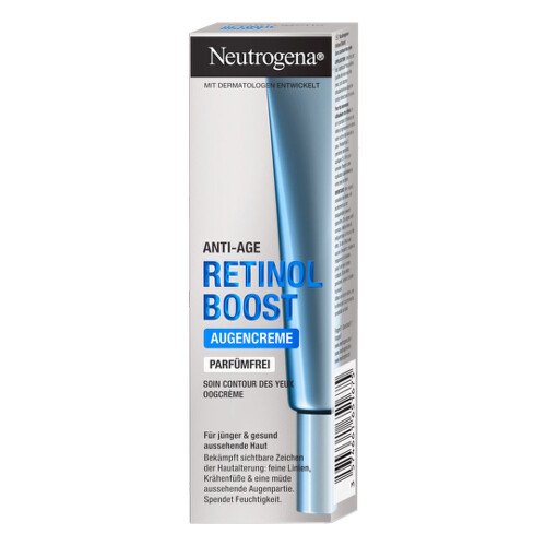 Neutrogena Retinol Boost Očný krém s čistým retinolom, vysoko účinnou látkou, ktorá urýchľuje produkciu kolagénu a obnovu pleťových buniek, bojuje proti jemným linkám a vejárom v okolí očí, pleť hydratuje a dodáva jej rozjasnený vzhľad. Pre pleť mladšiu & zdravú na pohľad. Dermatologicky potvrdený účinok u 100 % testujúcich.*(*Vedecké posúdenie dermatológmi, 36 testujúcich, používanie 1x denne.)