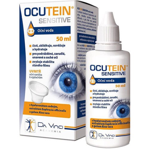 OCUTEIN SENSITIVE očná voda je zdravotnícka pomôcka, kombinuje hydratačný hyaluronát sodný s upokojujúcimi prírodnými rastlinnými výťažkami Euphrasia officinalis a gélu Aloe vera, jemne vymýva dráždivé látky, upokojuje, osviežuje a hydratuje suché a unavené oči.