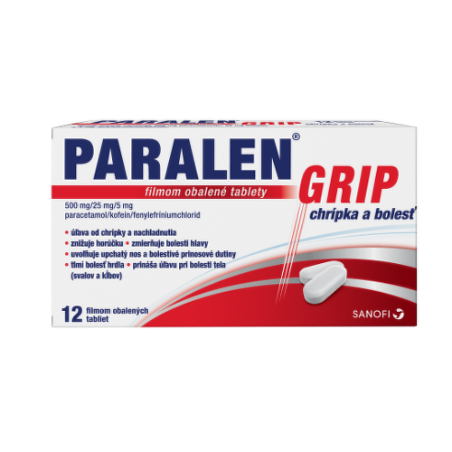 PARALEN GRIP chrípka a bolesť účinne zmierňuje mnohé príznaky prechladnutia a chrípky. Tieto príznaky zahŕňajú horúčku, bolesť hlavy, zimnicu, plný alebo upchatý nos, bolesti prinosových dutín a bolesť hrdla, bolesti svalov a kĺbov. Liek obsahuje kombináciu troch liečiv. Paracetamol znižuje horúčku a uľaví od bolesti, fenylefrín pomáha uvoľniť plný alebo upchatý nos a kofeín urýchľuje bolesť tlmiaci účinok paracetamolu a pomáha bojovať proti ospalosti a pocitu vyčerpania.