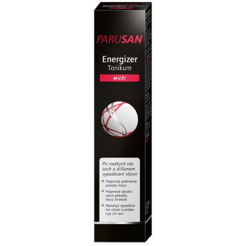 PARUSAN Energizer Tonikum Muži je výživný koncentrát, ktorý dodáva špeciálne koncentrované živiny vlasovej pokožke až ku korienkom. Okrem mnohých vysoko kvalitných látok (kofeínu, L-arginínu, vitamínu B3) obsahuje aj špeciálny extrakt, ktorý redukuje vypadávanie vlasov a výrazne zrýchľuje ich opätovný rast. Toto preukázala štúdia zameraná na riešenie vypadávania vlasov.
