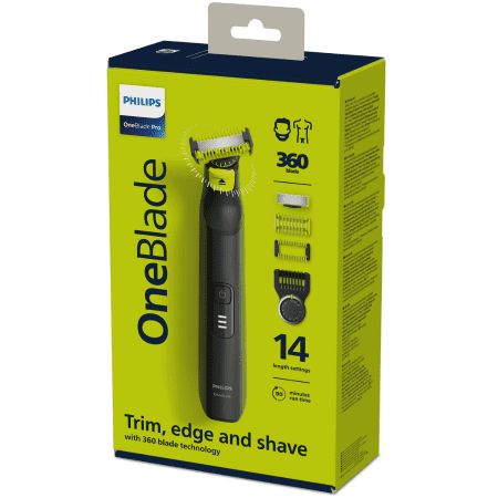 Súčasťou prístroja je špeciálne navrhnutý nadstavec na starostlivosť o telo a mimoriadne jemný nadstavec na pohodlné ošetrenie veľmi citlivých oblastí. Hrebeňový nadstavec umožňuje zastrihávanie na 14 rôznych dĺžok od 0,4 do 10 mm. Je na vašej voľbe, či budete prístroj používať nasucho alebo s vodou, s penou na holenie alebo bez nej. Philips OneBlade Pro 360 má spoľahlivú lítium-iónovú batériu a jej aktuálny stav môžete sledovať vďaka LED indikátoru na rukoväti.