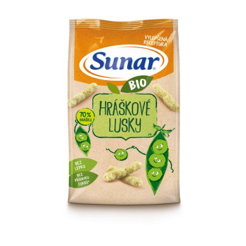 Sunar BIO hráškové chrumky sú chutné a zdravé maškrtenie bez pridaného cukru a soli. Obsahujú 70% BIO sušeného hrášku a BIO bezlepkovej obilniny. Vhodné pre deti od uk. 12. mesiace.