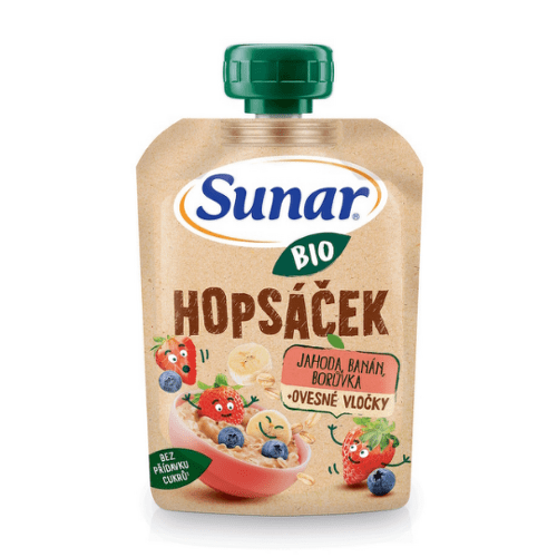 SUNAR Bio ovocná kapsička hopsáček jahoda banán čučoriedka ovsené vločky 100 g
