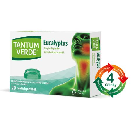 Tvrdé pastilky Tantum Verde® Eucalyptus obsahujú liečivo benzydamínium-chlorid. Tieto lieky sú určené na miestne použitie v ústach a v hrdle. Pred použitím lieku si pozorne prečítajte písomnú informáciu pre používateľa alebo sa poraďte so svojím lekárom alebo lekárnikom.
