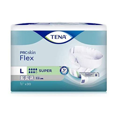 Nohavičky TENA Flex Super sú prispôsobivé inkontinenčné nohavičky s rýchloupevňovacím pásom navrhnuté tak, aby umožňovali jednoduchšiu a ergonomickejšiu výmenu produktu. Sú vhodné pre ľudí, ktorí sú mobilní, čiastočne mobilní alebo imobilní. Nohavičky TENA ProSkin Flex s technológiou FeelDry Advanced™ poskytujú výnimočnú ochranu tým, že rýchlo odvádzajú tekutinu z povrchu a zanechávajú pokožku suchú. Super absorpčné a rýchlo účinné jadro okamžite uzamkne moč pre pocit sucha, dokonca aj vo väčších množstvách, a plne priedušná vonkajšia vrstva ConfioAir™ umožní pokožke dýchať. Všetky tieto vlastnosti podporujú zdravie pokožky. Prispôsobiteľné upínanie ComfiStretch™ umožňuje prispôsobiť nohavičky anatómii tela, čím sa zvyšuje pohodlie a spoľahlivá ochrana pred únikom moču. Na účely jednoduchého používania rýchloupevňovací pás obsahuje suché zipsy, ktoré možno utiahnuť v prednej časti a plne tak prispôsobiť nohavičky, aby vyhovovali všetkým typom postavy.