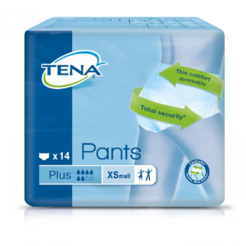 TENA Pants s tenším absorpčným jadrom ConfioFit™ sú naťahovacie absorpčné nohavičky, ktoré sa obliekajú ako bežná spodná bielizeň. Revolučný tvar jadra W robí pomôcku pod oblečením menej viditeľnú. Veľkosť XS (obvod bokov: 50 – 70cm), savosť – 1710 ml. Vhodné pri veľkom úniku moču (nad 20 ml za 4 hod) a fekálnej inkontinencii.