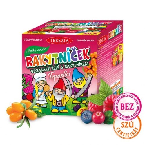 Nové vegánske želé RAKYTNÍČEK Trpaslíci divoké ovocie sú plné tých najdôležitejších vitamínov pre vaše deti. Šťavnaté želatínové vitamíny majú podobu roztomilých trpaslíkov. Každá želatínka v sebe ukrýva zmes ovocných koncentrátov, vitamíny a rakytník, teda perfektnú kombináciu pre posilnenie detskej imunity. Rakytník navyše pomáha znižovať únavu, podporuje činnosť srdca a tráviaceho traktu, pomáha udržiavať zdravú pokožku. Multivitamínové maškrtenie si malí objavitelia môžu brať so sebou na tábory, krúžky, do školy alebo môže slúžiť ako pravidelná odmena za zvládnutie ďalšieho náročného dňa. Pretože chápeme, ako vysoko citlivý detský organizmus je, želatínky neobsahujú konzervačné látky, sladidlá a ani pridané farbivá.