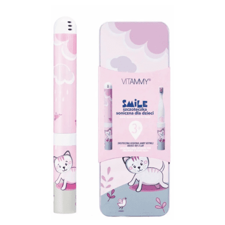 Veselá sonická zubná kefka VITAMMY SMILE pre deti od 3 rokov s motívom Kitty. Vďaka sonickej technológii sa zubná kefka postará o zdravý úsmev každého dieťaťa. VITAMMY SMILE má 2 režimy: normálny režim: 10 000 – 14 000 VPM, jemný režim: 8000–12000 VPM.