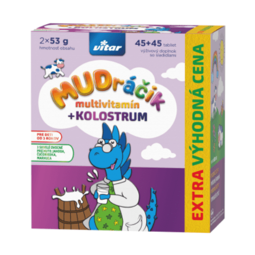 Výživový doplnok – multivitamínové tablety s obsahom kolostra. So sladidlami a hroznovým cukrom.