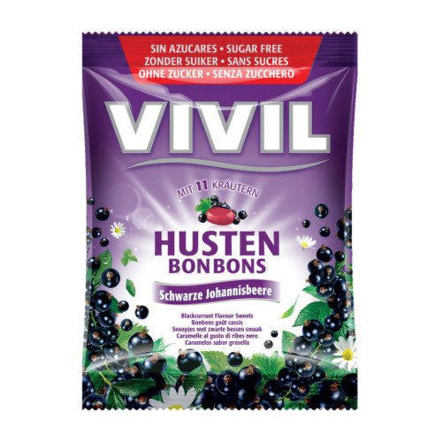 VIVIL HUSTEN-osviežujúce cukríky s príchuťou čiernych ríbezlí s výťažkom z 11 bylín bez cukru s náhradnými sladidlami.
